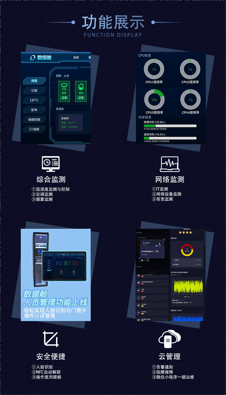 數據艙采用了嚴格的動環監控系統,包括煙霧監控、溫濕度監控、空調監控、視頻監控(選配)等,24小時保護IT設備安全。